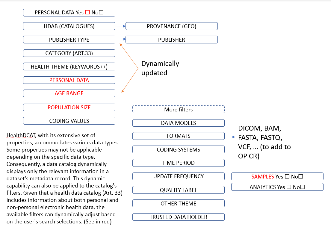 In addition, the search interface must be designed to present these facets clearly and intuitively to users. It is important to consider UX improvement in two ways: prioritising the facets and dynamically adapting the list of filters. - Prioritising the facets: Not all facets have the same level of relevance, and the pilot use cases have shown that data queries can have both commonalities and specificities (e.g., searching for a theme or a specific dataset format). The filter interface should be designed based on these insights. - Dynamically adapting the list of filters: A health dataset catalogue governed by Article 33 encompasses both personal and non-personal electronic health data. Several metadata elements introduced by Health DCAT-AP, which function as facets, are applicable only to specific types of data (e.g., either personal or non-personal). As a result, the filters can be dynamically adjusted based on the user's search criteria, ensuring that users are presented with the most relevant options. (See Fig. 4: 'Optimised Filters for HealthDCAT-AP Dataset Catalogues: Dynamic Display Based on Personal Data Inclusion') |