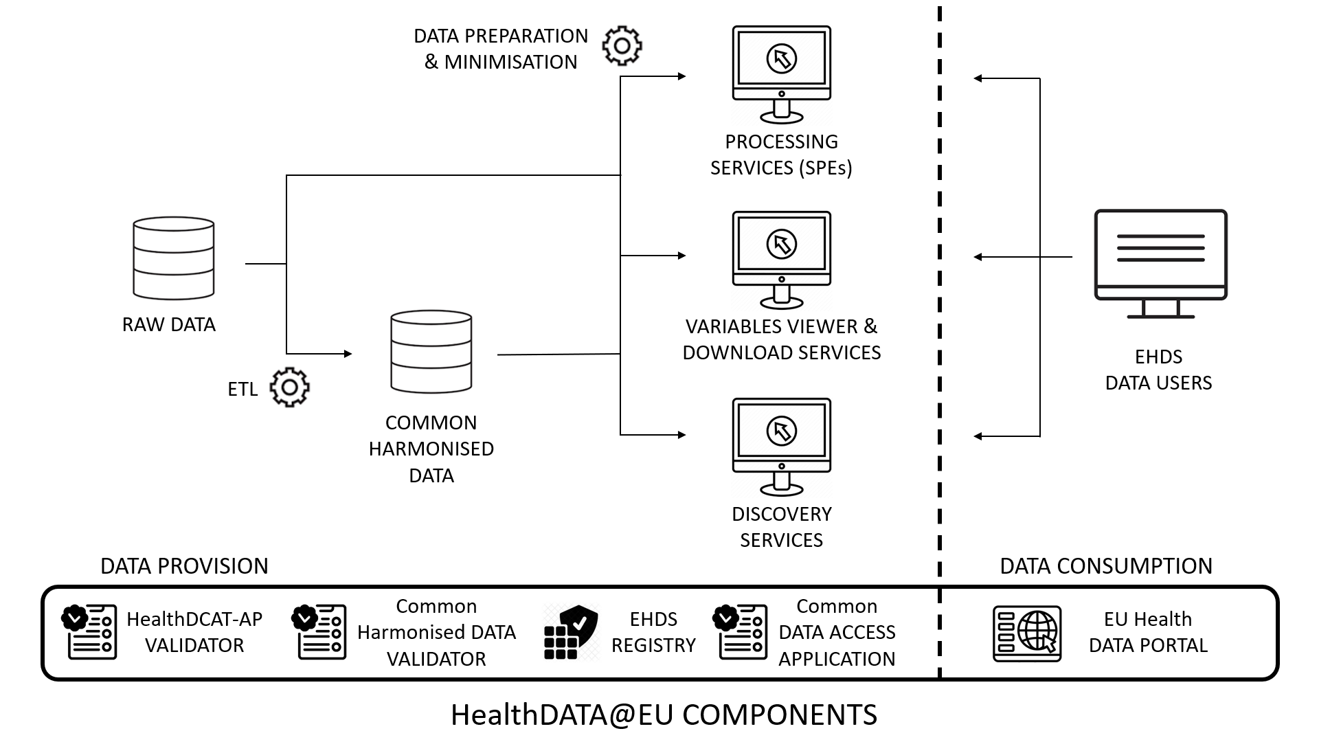 Given the federated nature of the healthDCAT@EU infrastructure, the concept of 'virtual' datasets, as discussed above, can be considered across the EHDS. Through HealthDCAT-AP, common harmonised data models and datasets could be promoted and accurately described. Figure 9 presents a graphical representation of the EHDS components supporting secondary data use, divided into two main categories: on the left, the provision of relevant health data for health data holders and Health Data Access Bodies, and on the right, the consumption of relevant data for health data users. The concept of this figure comes from the JRC Science for Policy report INSPIRE – A public sector contribution to the European Green Deal data space (Fig. 11, p. 36). Additional components have been added, illustrating the data flow to PROCESSING SERVICES (Secure Processing Environments), common DATA ACCESS APPLICATION forms and clarifying that the EHDS does not required raw data to be harmonised before publication. While the EHDS does not required and generalised data harmonisation, this does not preclude organisations, such as research infrastructures, from coordinating and agreeing on common data models and virtual datasets for the EHDS. This approach supports federated analysis and learning by making the data ready for processing. (Note: Interoperability requirements for Processing Services essential for federated analysis and learning fall outside the scope of this document.) |