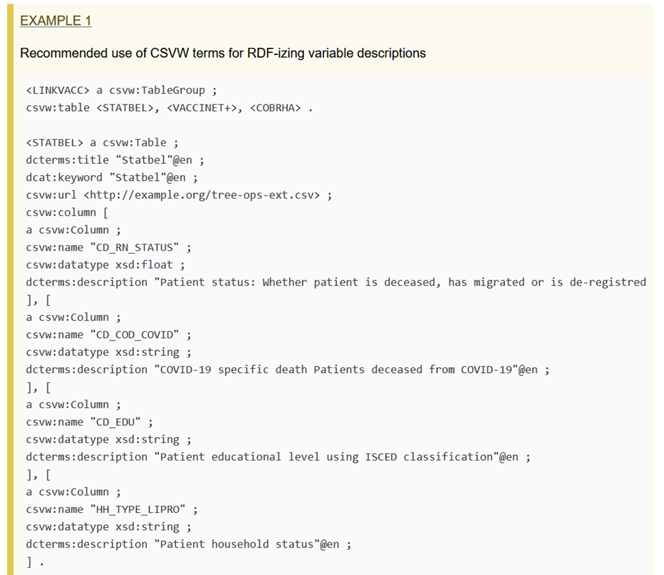By effectively RDF-izing variable descriptions using the CSVW vocabulary, the data dictionary can be presented as RDF in a sample Distribution. This ensures alignment with the RDF framework of DCAT facilitating better data interoperability and usability which is expected for supporting the data access application service of the EU health dataset catalogue. To summarise, HealthDCAT-AP requires data holders to provide a sample distribution of the dataset (e.g., mock-up data, anonymised data, synthetic data, etc.) in any computer-readable format (e.g., CSV, JSON). If applicable, a data dictionary should also be published. The data dictionary must be published using CSVW, resulting in an RDF format for the sample distribution. A more complex use case involves merging both requirements by simultaneously producing the dataset sample as tabular data along with its data dictionary using CSVW: |