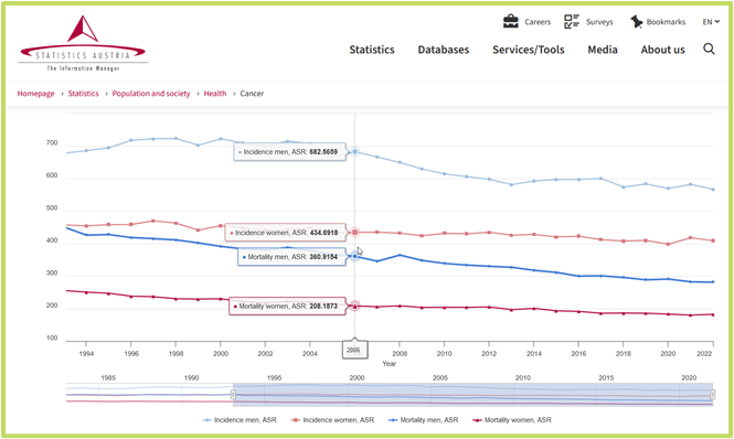 Example 2: the Austrian National Cancer Registry dashboard provides information on the different types of cancer, focusing on the organ and tissue type affected by cancer. The basis is the Austrian National Cancer Registry maintained by Statistics Austria, in which cases diagnosed or treated in hospitals are registered. |