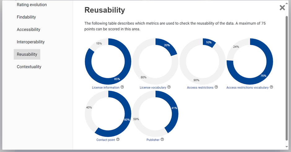 In this context, the EU Data Portal has provided a general approach for the HealthDCAT-AP draft specification. The EU Data Portal defines a quality framework for checking metadata against various indicators, termed "Metadata Quality Assurance". This quality assurance is based on five dimensions: Findability, Accessibility, Interoperability, Reusability, and Contextuality. These dimensions are practical implementations of the FAIR data principles, and derived from the computation of selected DCAT-AP properties. For instance, the Reusability dimension is evaluated by analysing information provided for "Licence information," "Licence vocabulary," "Access restrictions," "Access restrictions vocabulary," "Contact point," and "Publisher". An average score, termed "Rating evolution," is generated, and a visualisation output is available for each dimension: |