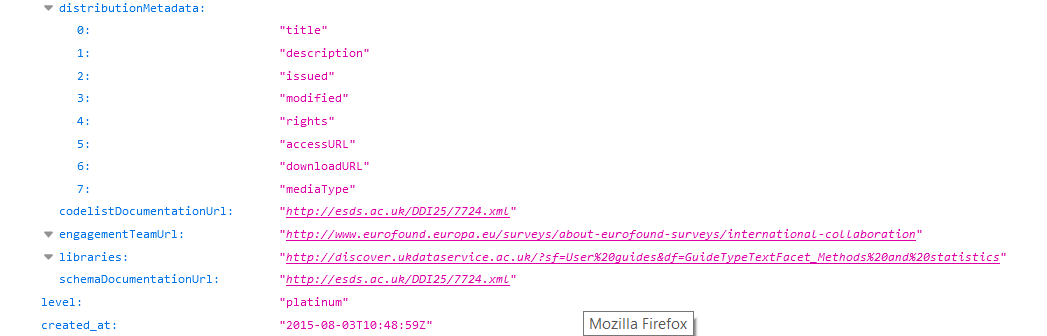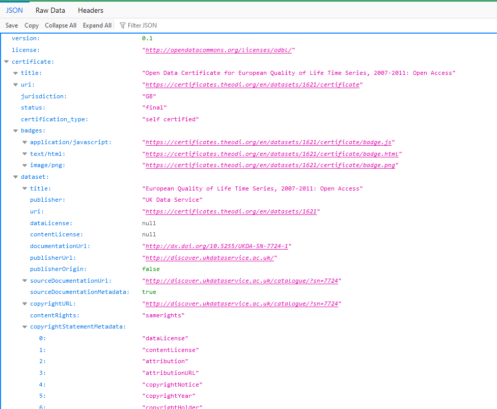 The dataset 'European Quality of Life Time Series, 2007 and 2011' has achieved Platinum (Expert level) certification from the Open Data Institute (ODI). The Open Data Institute facilitates an auto-certification process by retrieving DCAT metadata records. Although the certificate is not available in RDF format (and thus lacks the RDF-based DQV vocabulary structure), it is still accessible in a machine-readable JSON format (see example below). The quality certificate generated by the ODI service can be incorporated into HealthDCAT-AP using the dqv:hasQualityAnnotation property as a dqv:QualityCertificate. The service implemented by ODI offers significant advantages, enabling any data holder to automatically generate a data quality certificate based on their dataset description. Data holders can enrich the certificate by adding additional information, such as technical quality metrics and user feedback reported, for instance, by the Health Data Access Body (HDAB). The HDAB can then use the generated certificate to create a graphical representation, as outlined in Article 2 (ae) of the EHDS Regulation, by accessing its machine-readable format. This flexibility allows the HDAB to customise the appearance of the graphic in its data catalogue. Furthermore, HealthDCAT-AP's approach supports data holders in subscribing to various quality and utility frameworks, enhancing the adaptability and interoperability of their datasets. These frameworks could be designed by the HDAB, a Member State, the EHDS, the common EU Data Spaces, or any relevant organisation (e.g., EOSC). |